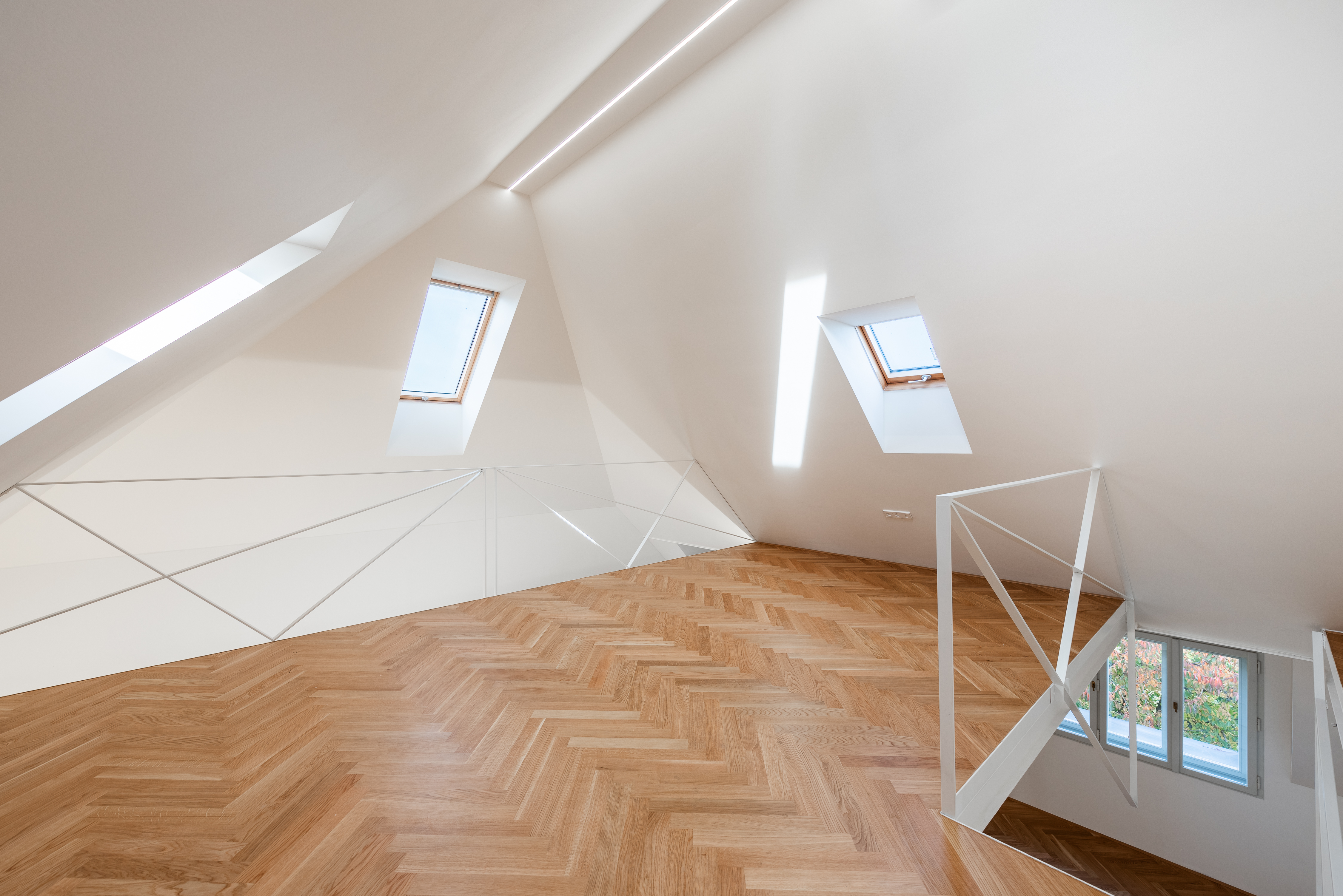 Galerie v hlavní obývací části byla navržena již od samého počátku jako výrazný architektonický prvek. Její konstrukce je tvořena ocelovým rámem, který umožnil vytvořit velkorysý otevřený prostor bez jediného podpůrného prvku krovu. Základ rámu tvoří ocelové válcované profily, příčně ztužené charakteristickou „cik-cak“ trubkovou konstrukcí. Ve stejném duchu je navrženo také zábradlí z ploché oceli se síťovinou vetknutou mezi šikminy střechy, které podtrhuje lehkost celého prostoru. Na tuto estetiku navazuje i konzolové schodiště – jeho stupně z ohýbaného plechu mají trojúhelníkový tvaroslovný motiv, který se v interiéru opakuje. Strop galerie je záměrně proveden z cementotřískových desek, aby se vizuálně odlišil od původní konstrukce a současně odkazoval na pohledový beton použitý v nižším podlaží(2.NP). Tento prvek citlivě člení výšku obytné haly, která by jinak působila příliš velkoryse a ztrácela by na útulnosti. Nedělí však prostor zcela – ponechává mu volnost a plynulost, přirozeně ustupuje od přední strany, aby umožnil pronikání světla do středu dispozice prostřednictvím střešních oken. Vrchní část je navíc možné oddělit skleněnou stěnou a vytvořit tak další samostatnou místnost, aniž by se narušila lehkost a vzdušnost celého prostoru.