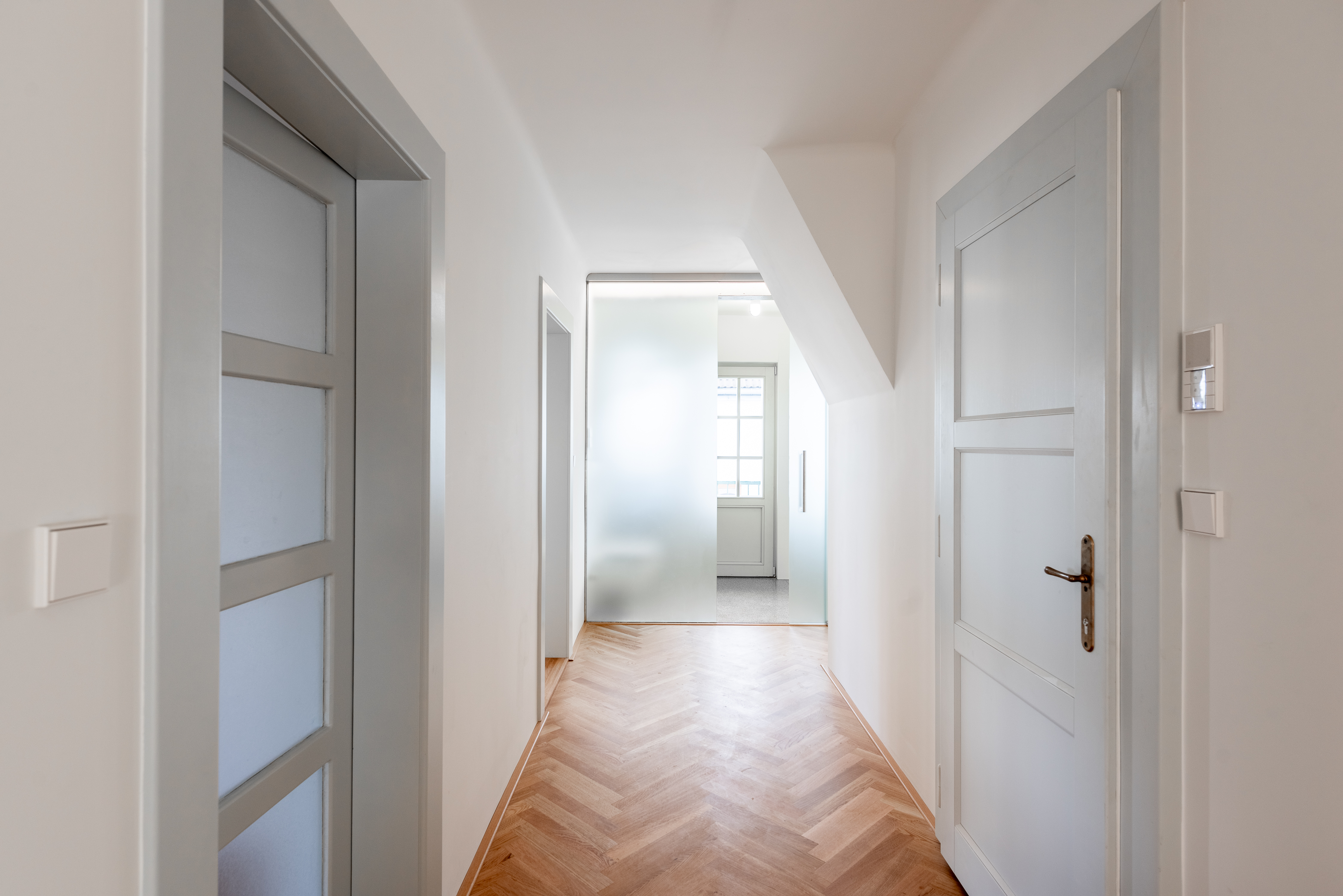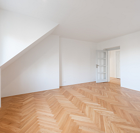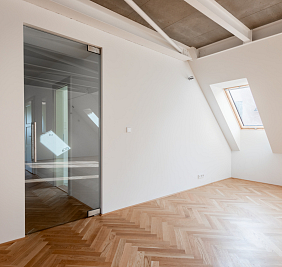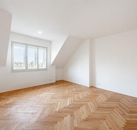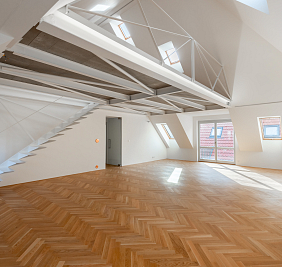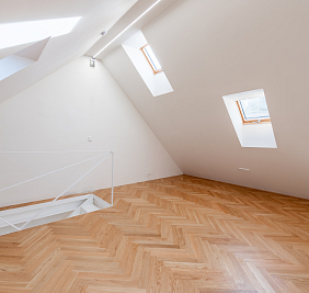 Přestože se byt nachází v podkroví, jeho interiér působí překvapivě civilně a komfortně. Architektonická práce s prostorem potlačuje obvyklé limity podkrovního bydlení – převládají rovné linie, plnohodnotná výška stropů a klasická okenní otvorová konstrukce. Byt je nově dokončen po kolaudaci a připraven k citlivému dotažení v individuálním interiérovém stylu nového majitele.