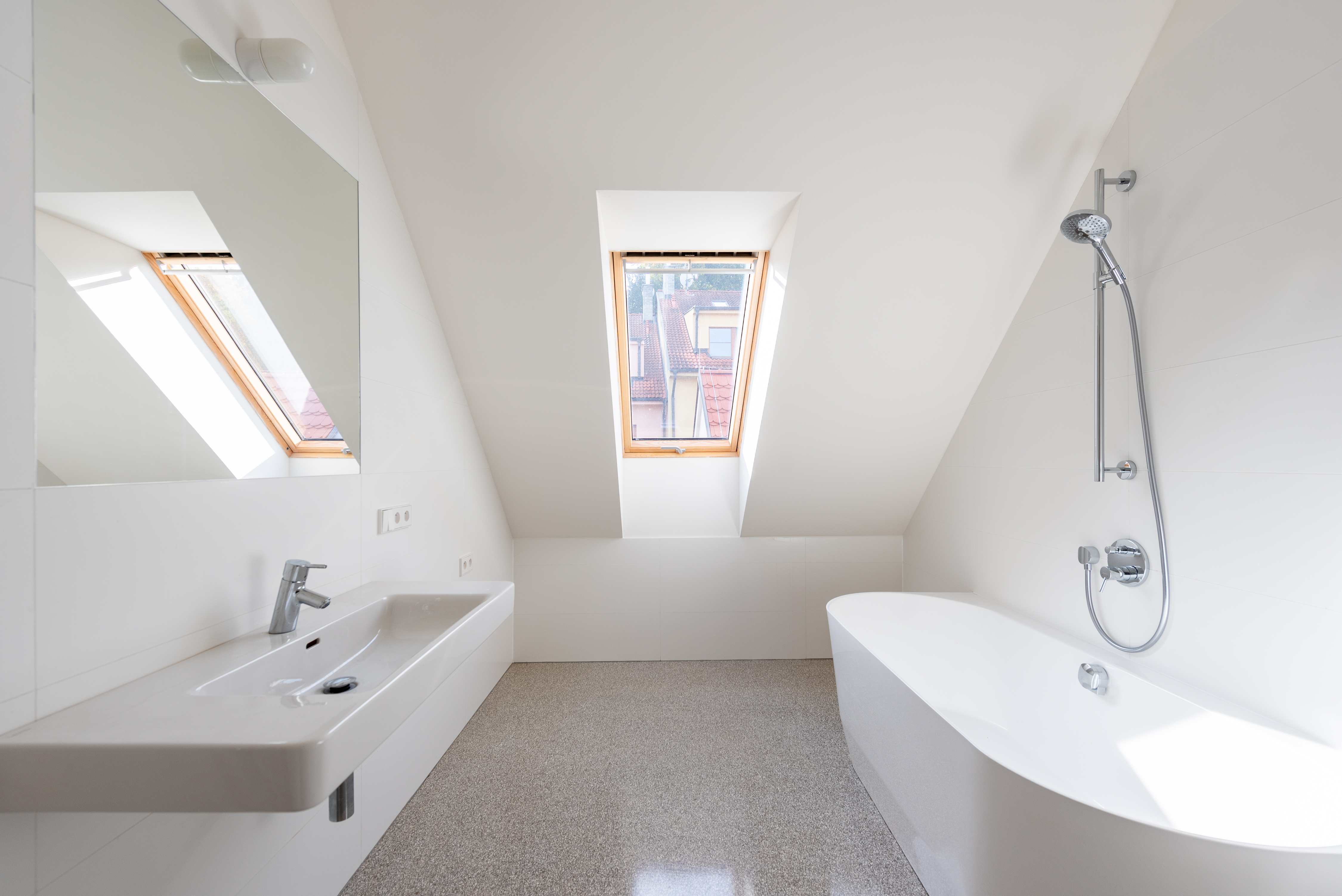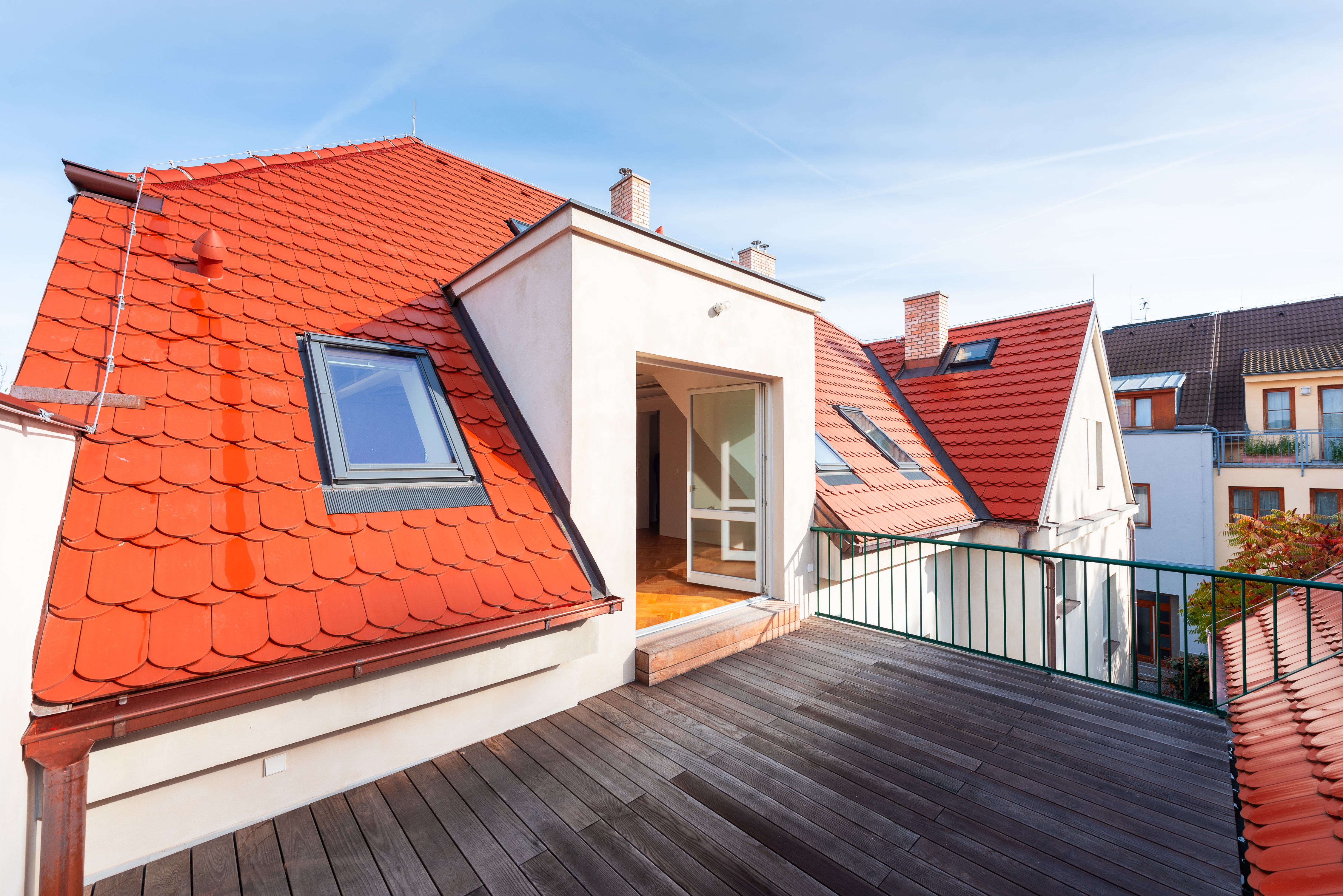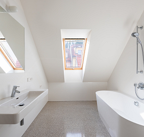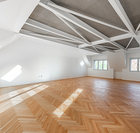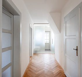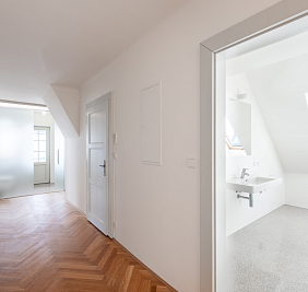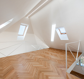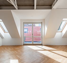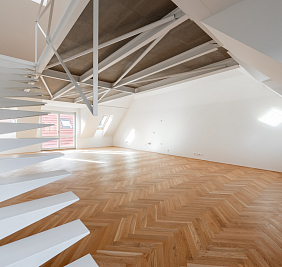 Přestože se byt nachází v podkroví, jeho interiér působí překvapivě civilně a komfortně. Architektonická práce s prostorem potlačuje obvyklé limity podkrovního bydlení – převládají rovné linie, plnohodnotná výška stropů a klasická okenní otvorová konstrukce. Byt je nově dokončen po kolaudaci a připraven k citlivému dotažení v individuálním interiérovém stylu nového majitele.