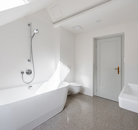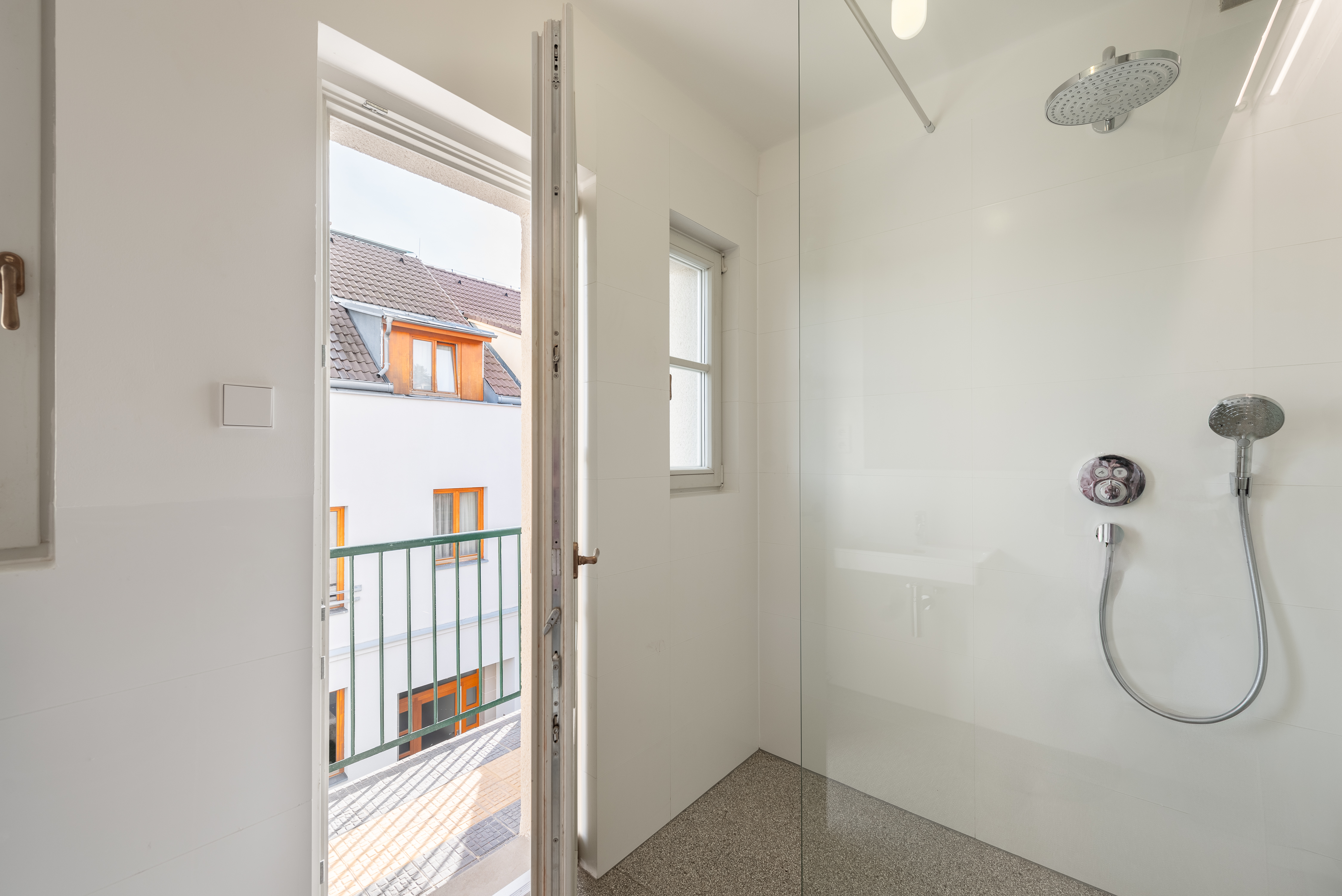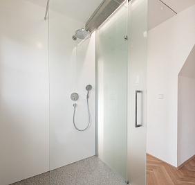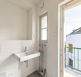 Dispozice bytu ve třetím nadzemním podlaží je koncipována s důrazem na velkorysost a jasnou prostorovou logiku. Dominantou je propojený obytný prostor orientovaný do klidového vnitrobloku, připravený pro instalaci kuchyně i krbu. Na hlavní obytnou část navazuje jižně situovaná terasa a lodžie, které přirozeně rozšiřují životní prostor do exteriéru. Součástí bytu jsou tři promyšleně umístěné pokoje s dostatkem soukromí a dvě koupelny. Jedna z koupelen se vyznačuje kultivovaným řešením s volně stojící vanou umístěnou u okna, kde přirozené světlo zvýrazňuje kvalitu použitých materiálů i celkový architektonický výraz. Druhá koupelna se sprchovým koutem, elegantně začleněná do místa původní lodžie, otevírá přímý vstup na balkon a nabízí autentický výhled do jedné z nejpůvabnějších uliček Starých Střešovic.